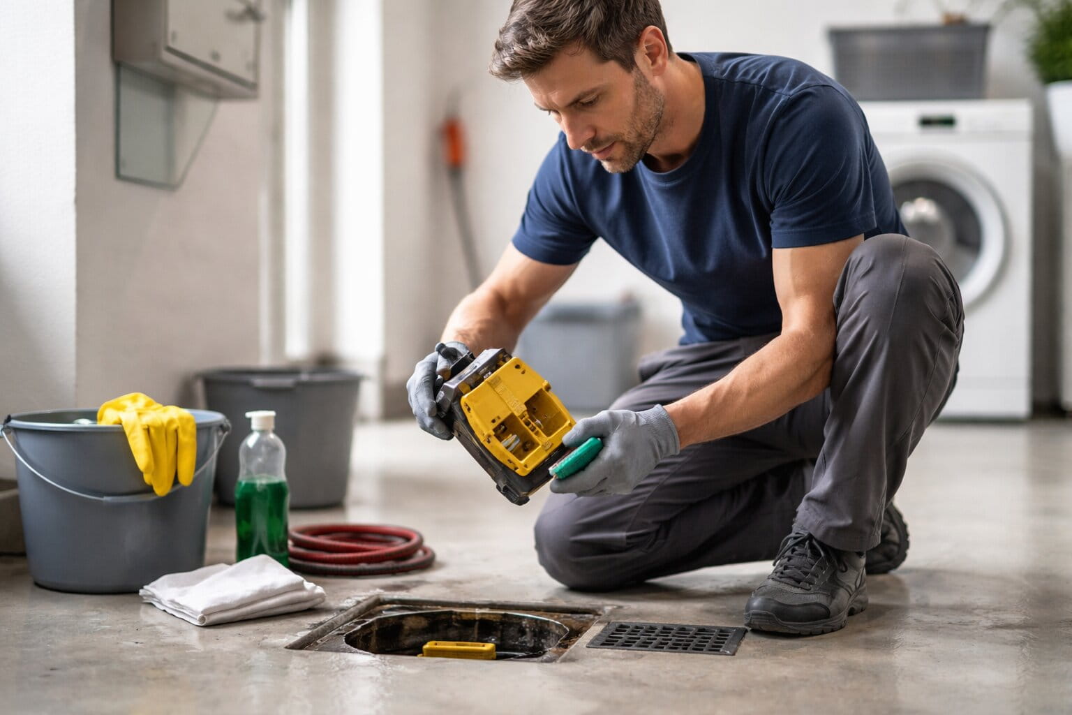 Ziehe wasserdichte Arbeitshandschuhe an und stelle den Arbeitsbereich gut beleuchtet und zugänglich sicher. Öffne den Revisionsschacht oder die Abdeckung. Bei manchen Modellen musst du die Klappe mit Werkzeug herausheben. Lege einen Auffangbehälter bereit.