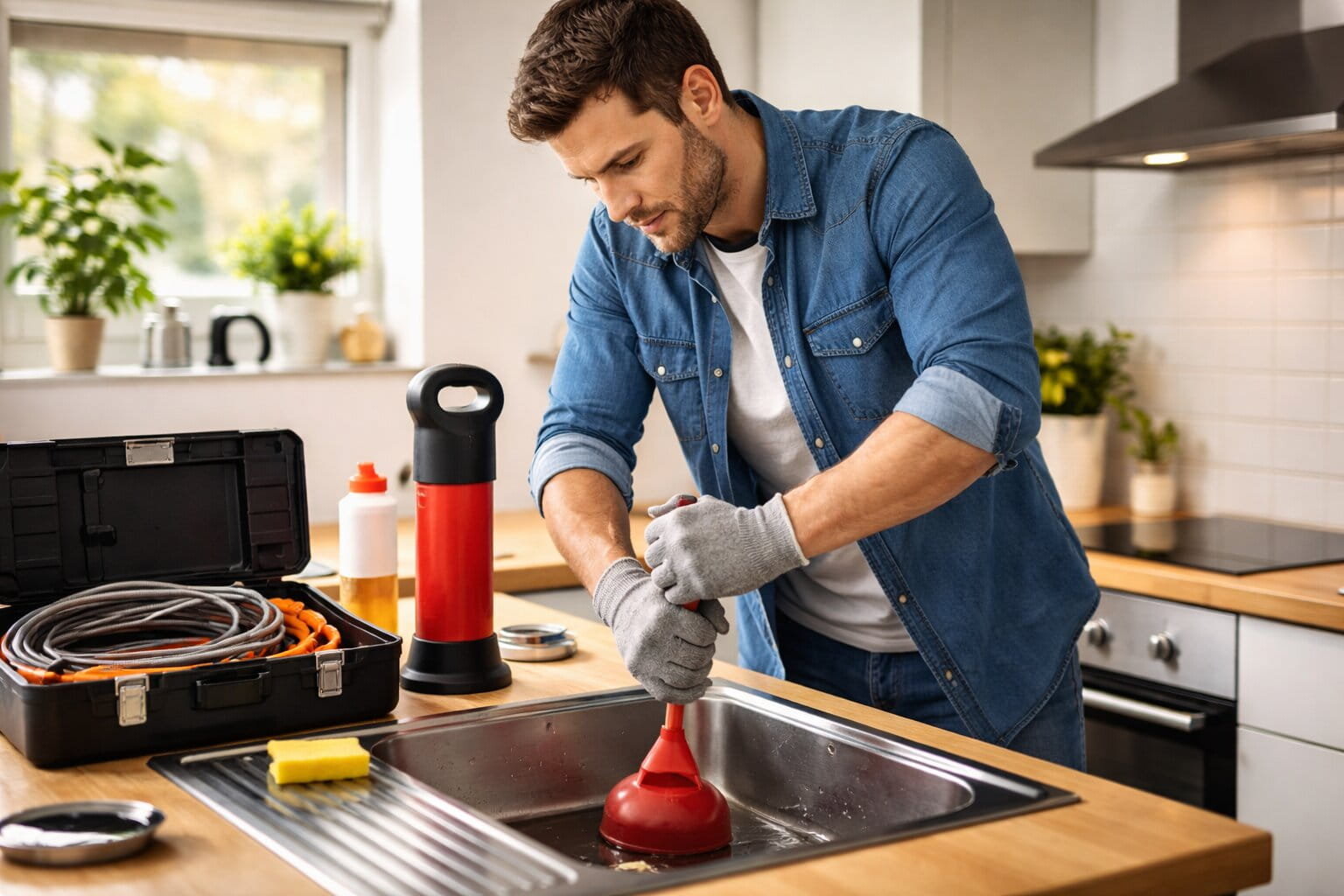 DIY Rohrreinigung bedeutet, eine Verstopfung ohne Klempner selbst zu beheben. Du nutzt Hausmittel, mechanische Werkzeuge wie Pömpel, Rohrreinigungspumpe und Rohrreinigungsspirale – und gehst systematisch von leicht nach schwer vor. Die meisten Verstopfungen entstehen durch Haare, Fett oder Seifenreste im Siphon-Bereich oder in den ersten Metern des Abflussrohrs. Diese Blockaden lassen sich in der Regel selbst lösen, wenn du die richtige Methode in der richtigen Reihenfolge anwendest.