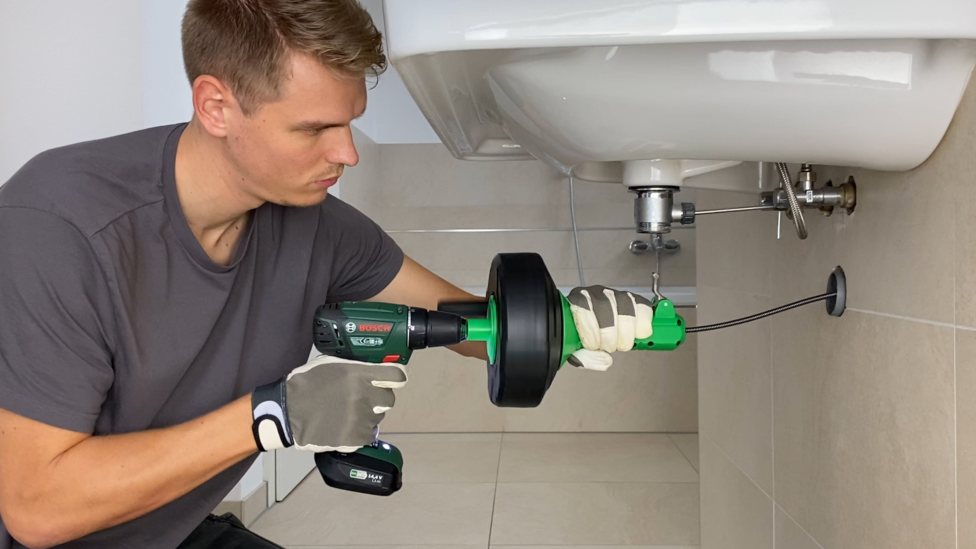 Die Handkurbel reicht für viele Verstopfungen aus – besonders wenn die Blockade im Siphon oder in den ersten Metern der Leitung sitzt. Du kurbelst im Uhrzeigersinn, die Spirale arbeitet sich vor, und nach wenigen Minuten ist der Abfluss frei. Bei tiefer sitzenden Verstopfungen oder verkrusteten Pfropfen aus Fett, Kalk oder Urinstein wird das Kurbeln jedoch anstrengend. Die Bohrmaschine übernimmt die Rotation und liefert gleichmäßige Drehung ohne Kraftaufwand. Du musst nur den Vorschub steuern – entweder manuell, indem du die Spirale nachschiebst, oder mit automatischem Vorschub, falls deine Spirale diese Funktion hat.